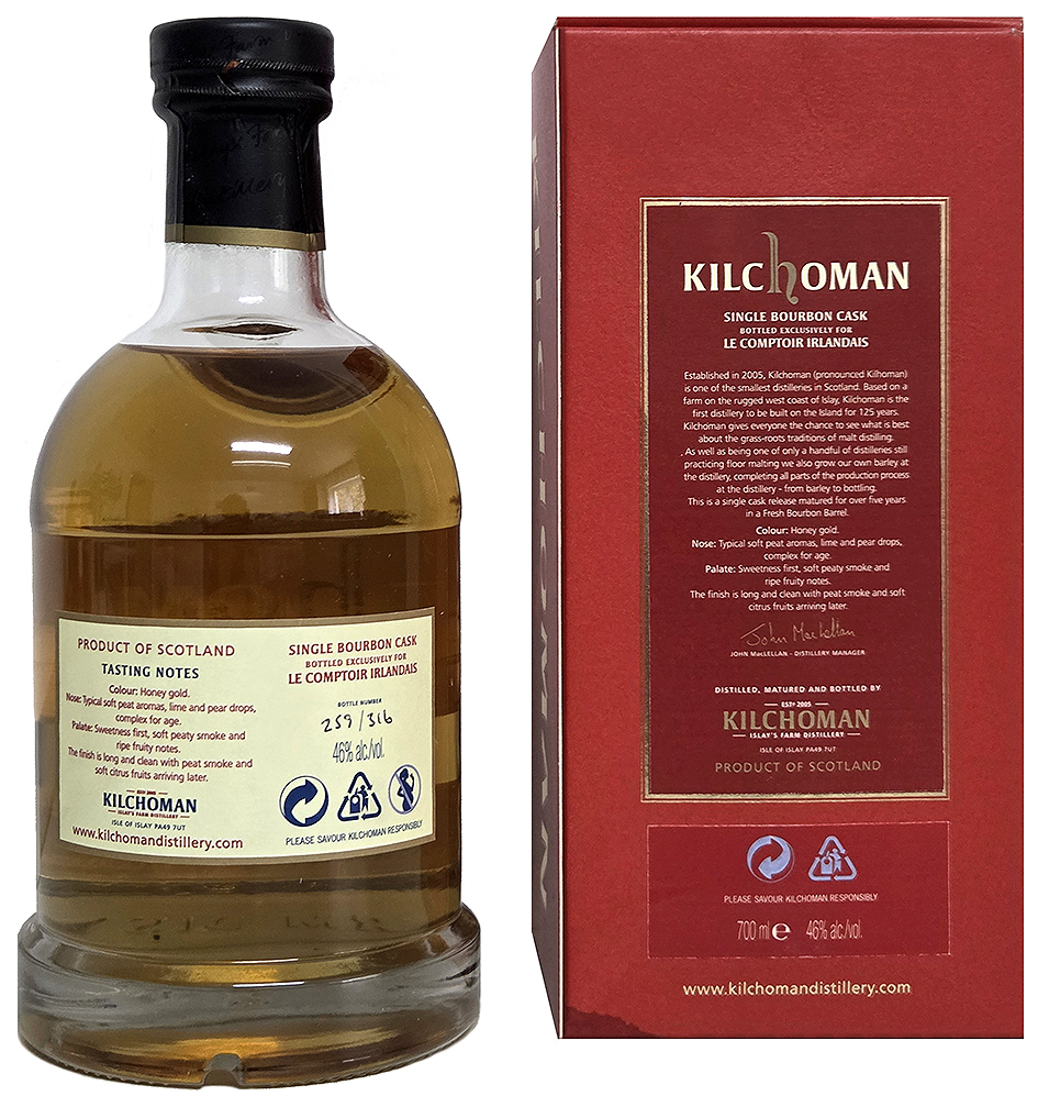 This single cask release was bottled at the end of 2013 for the French shop Le comptoir Irlandais. The whisky matured for just over 5 years in a fresh ex-bourbon barrel. This is one of the rare Kilchoman single cask bottlings that has been diluted to 46.0% alcohol and not released at cask strength.