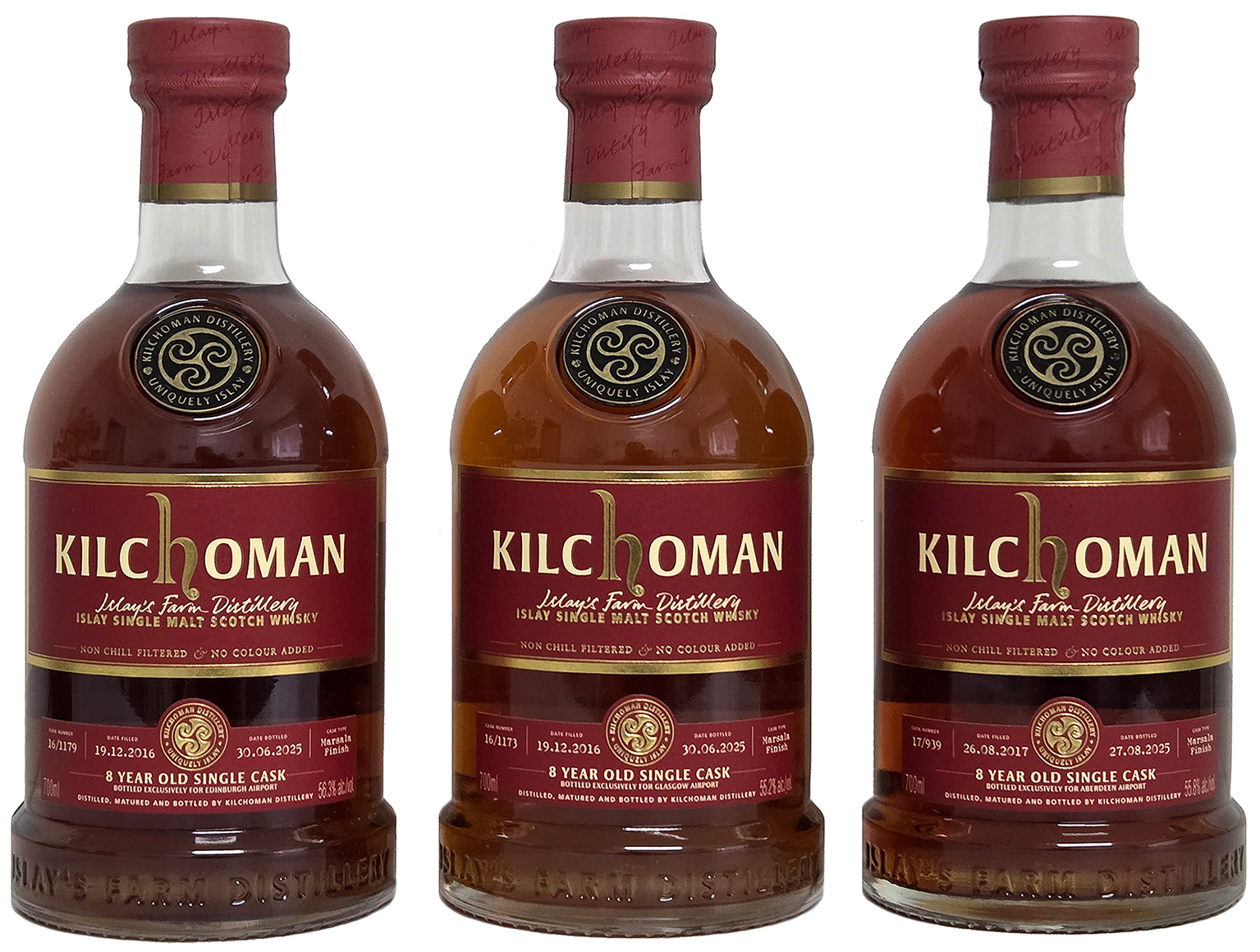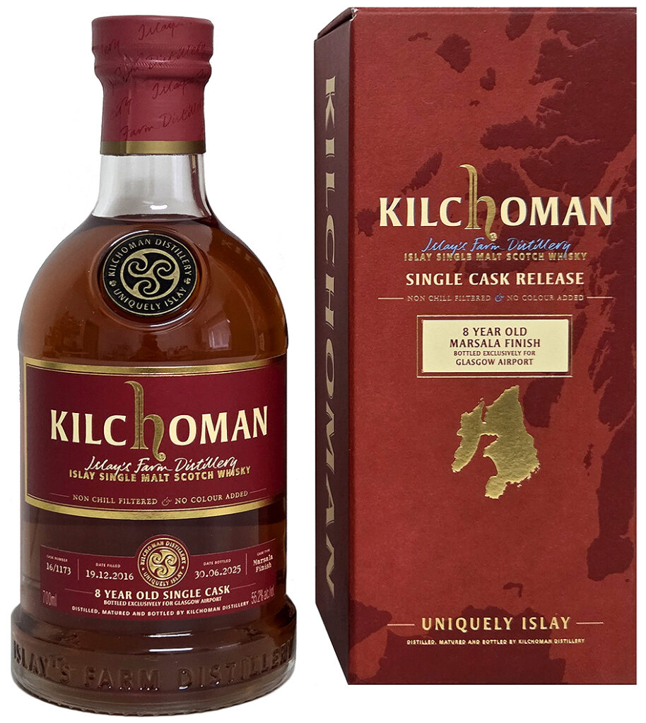 Nun hat Kilchoman erstmals in seiner Geschichte auch Einzelfassabfüllungen für den Travel Retail veröffentlicht. Es handelt sich hierbei um je ein Marsala Single Cask Finish für die drei großen schottischen Flughäfen Edinburgh, Glasgow und Aberdeen. Alle drei Abfüllungen sind 8 Jahre alt und wurden 2 Jahre lang in Marsala Fässern nachgereift.