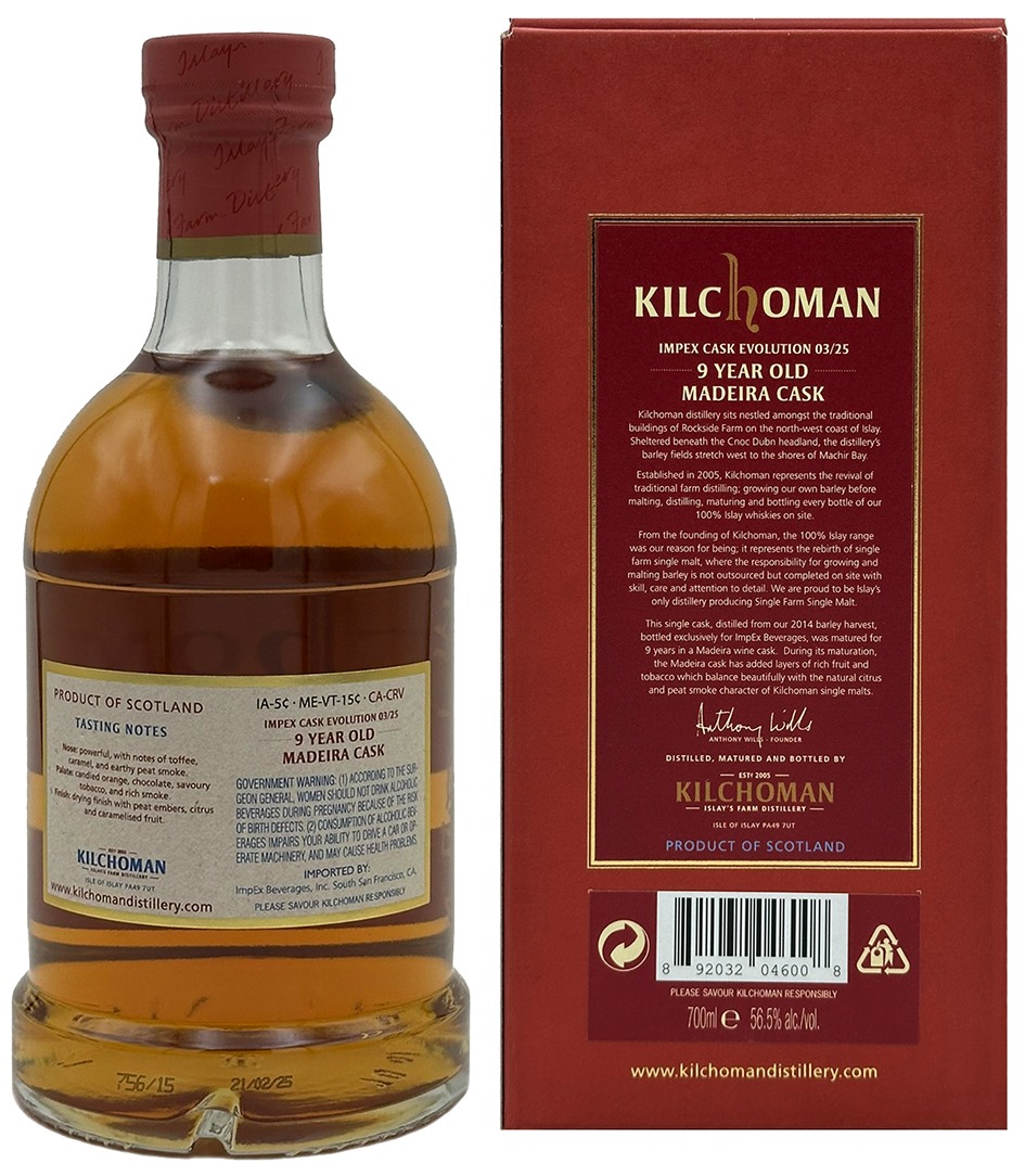 Am 20. März 2025 kündigte der US-amerikanische Kilchoman-Importeur ImpEx Beverages eine Reihe von Neuerscheinungen für das Jahr 2025 an, darunter auch drei neue Einzelfass-Abfüllungen in seiner renommierten Cask Evolution Serie. Als Nummer 03/2025 dieser Serie wurde das hier genannte, bereits am 21. Februar abgefüllte 100% Islay Madeira Single Cask avisiert.